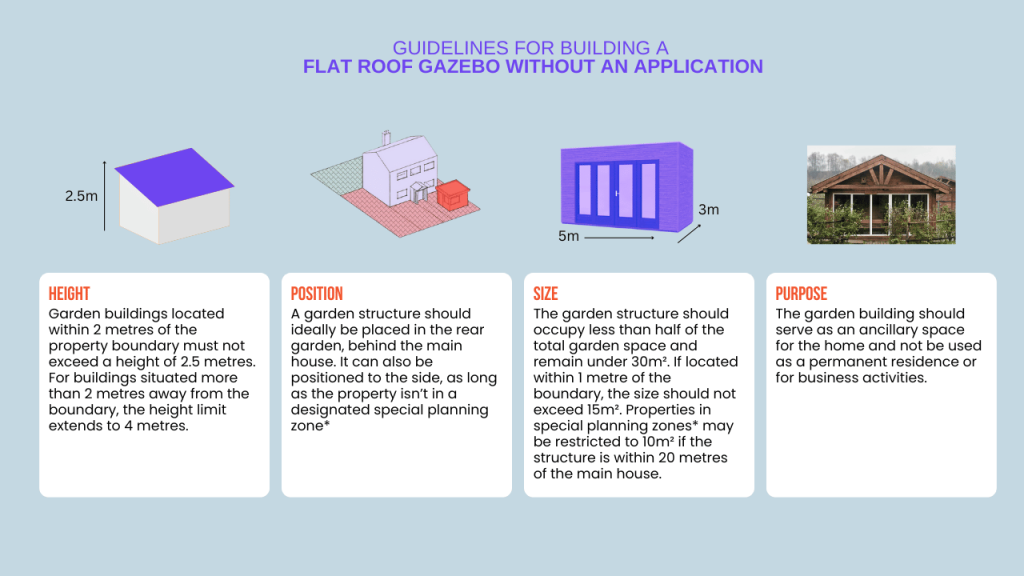 In most cases, a flat roof gazebo does not require planning permission if it is less than 2.5m in height and located within your property’s boundaries. However, always check local regulations to ensure compliance.